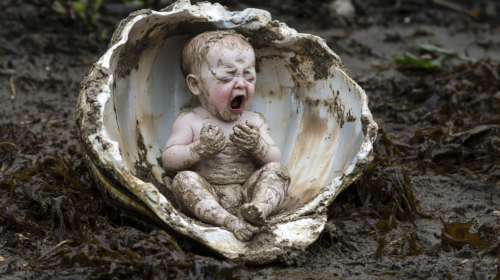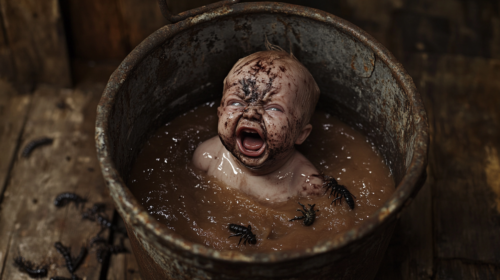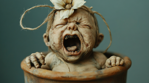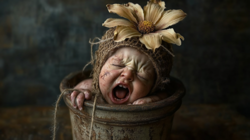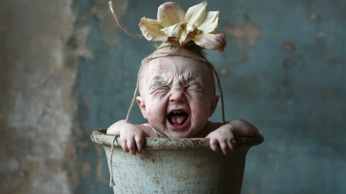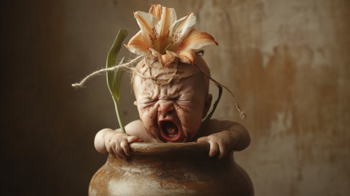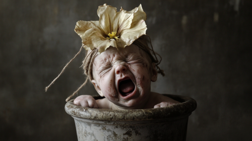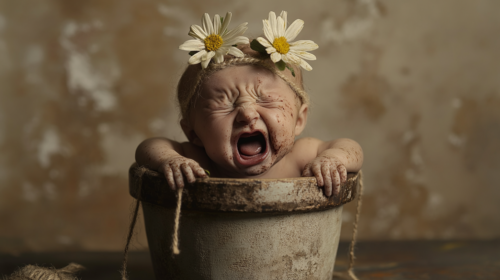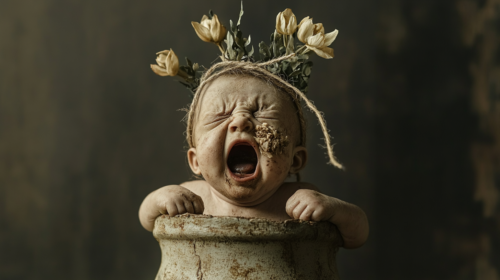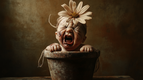 One baby fit so snugly in a terra-cotta pot that we almost left him there, like a gift to the gardener of fate. Another kept vomiting uncontrollably, but hey—that’s texture. We shot them all against a pastel backdrop of neon pink (#FF00EA) and electric blue (#649DFC), and the results were chef’s kiss. Nothing says “delicate innocence” like a cholera-ridden infant in a hydrangea pot. Anne Geddes, eat your heart out.
