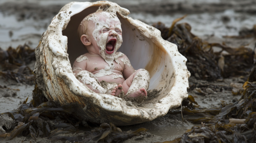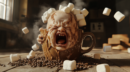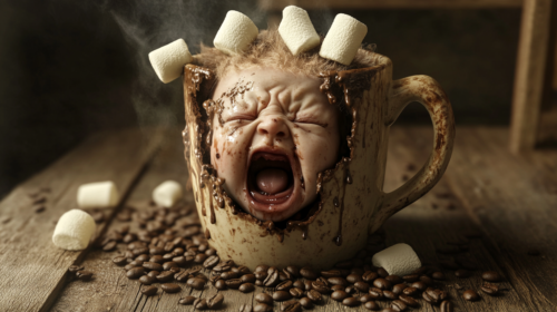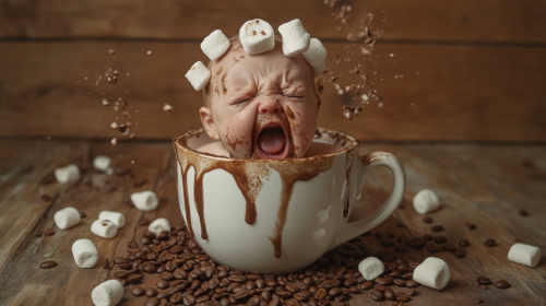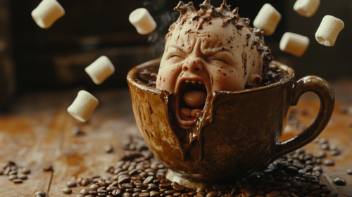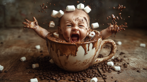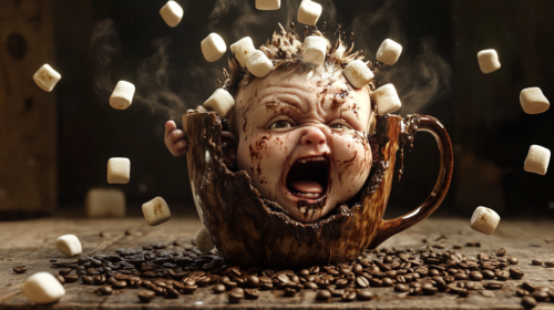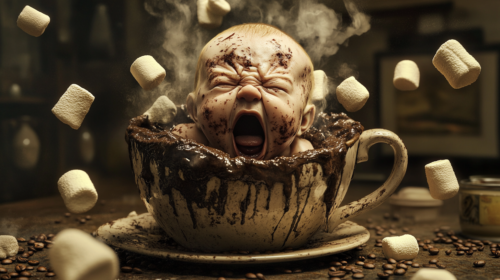 The mugs were chipped, the cappuccinos were steaming, and the babies? Unbelievably loud. We thought the warm foam might soothe them, but nope—still screaming. So naturally, we started pelting them with marshmallows. (What else were we supposed to do? Use earplugs? Be reasonable?) One baby, Sporkella, caught a marshmallow in her mouth mid-scream, which honestly made for a stellar action shot. Another baby, Clamblet, managed to tip their mug entirely, froth and all—what a drama queen. But hey, chaos makes the best art, and these babies? Absolute masterpieces.